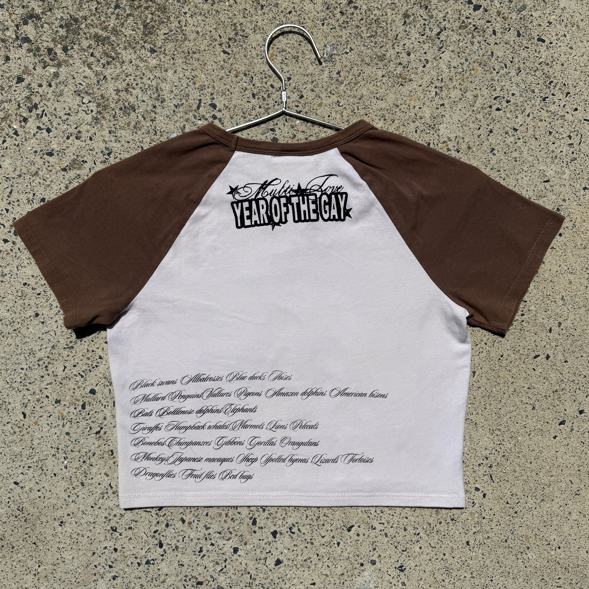 thrifted off white raglan baby tee with light brown sleeves made from 96% cotton and 4% elastaneSCREENPRINTED BY MULTI-LOVE